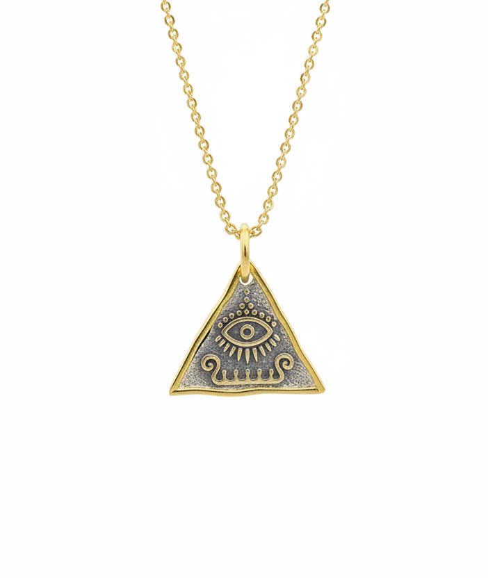 Üçgen Gözü tasarımı, koruma, sezgi ve aydınlanmanın güçlü bir sembolüdür. Antik inançlardan esinlenen üçgenin içindeki göz, genellikle içgörü ve ruhsal rehberlikle ilişkilendirilir ve takan kişiye koruma sunar. Bu kolye, antik gizemi çağdaş zarafetle birleştirerek onu derin bir anlamı olan özgün bir aksesuar haline getirir.