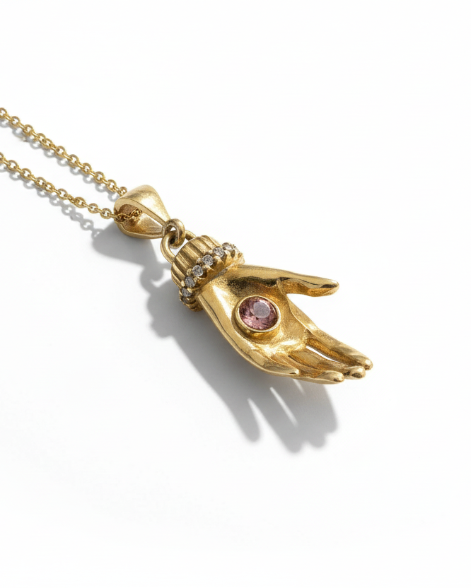 - Anlamı: Mistik El Kolyesi, genellikle mistik ve koruyucu niteliklerle ilişkilendirilen el sembolünden esinlenen büyüleyici bir tasarıma sahiptir. Genellikle Hamsa veya Fatima Eli olarak adlandırılan bu tasarım, olumsuz enerjileri savuşturma ve iyi şans getirme yeteneğiyle ünlüdür. Korumayı, rehberliği ve ilahi müdahalenin gücünü temsil eder. Mistik El Kolyesi hem güzel bir aksesuar hem de bir tılsım görevi görür ve bu da onu yanlarında bir güvenlik ve pozitif enerji hissi taşımak isteyenler için mükemmel bir parça haline getirir.