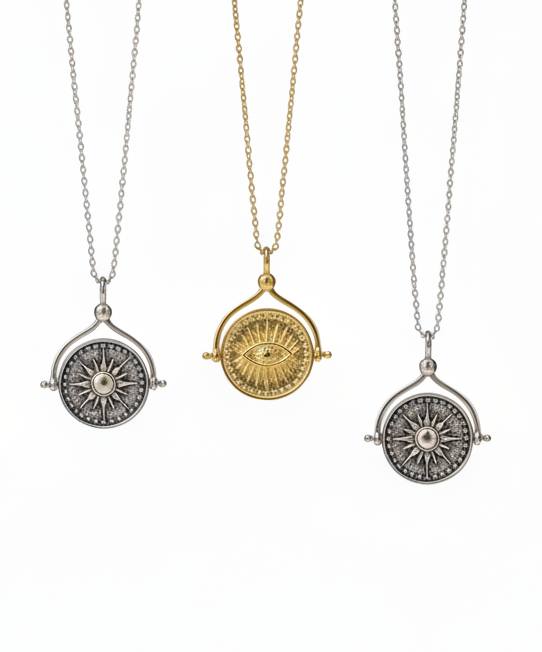 • Dönen kolye: Bir yüzünde sıcaklık ve hayatı temsil eden güneş, diğer yüzünde ise sezgi ve korumayı simgeleyen göz yer alıyor.